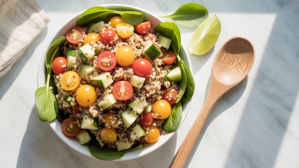 This colorful salad is loaded with fresh vegetables, offering vitamins and minerals essential for overall health.