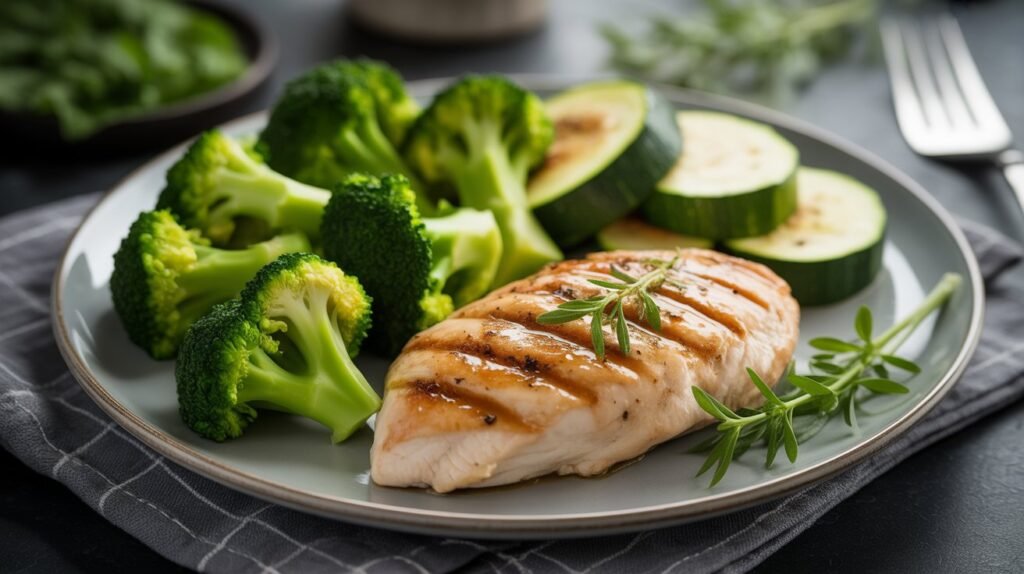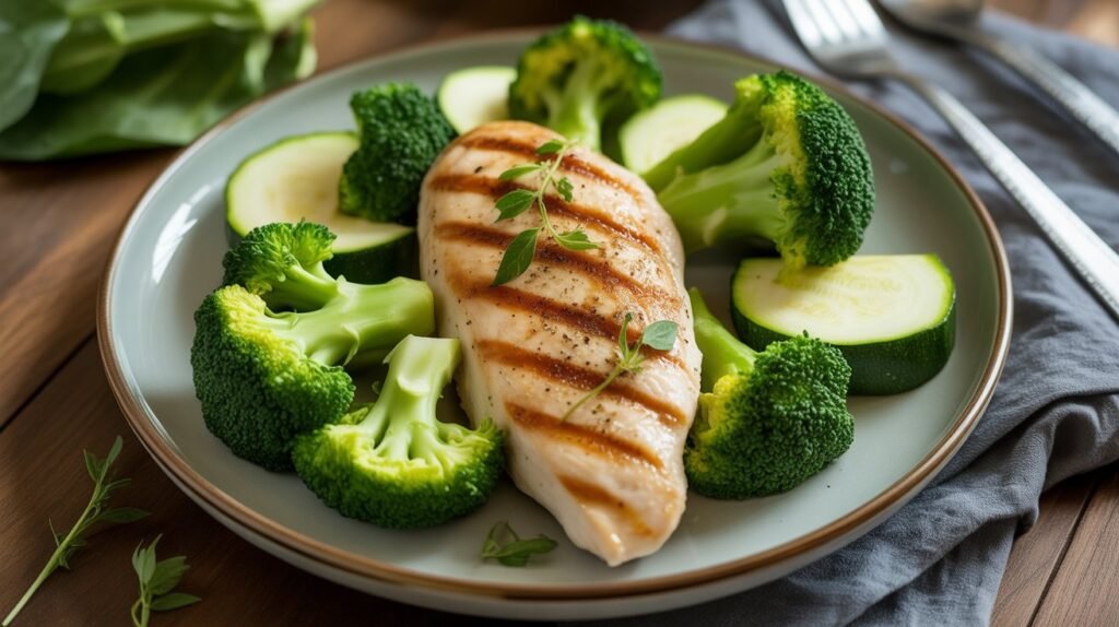 This high-protein, low-carb meal is ideal for maintaining stable blood sugar levels. Grilled chicken provides lean protein, while vegetables offer fiber and essential nutrients.