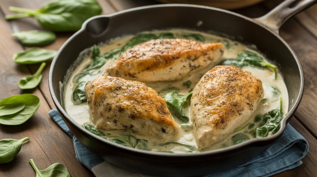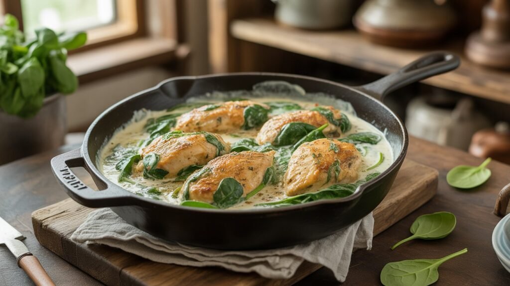 Greek yogurt adds tanginess and creaminess without the extra calories of heavy cream. Combined with tender chicken and spinach, this meal delivers both protein and essential nutrients.
