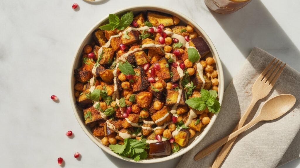 Chickpeas are rich in plant-based protein and fiber, making them incredibly filling. Roasted eggplant adds texture and depth to this nourishing bowl.