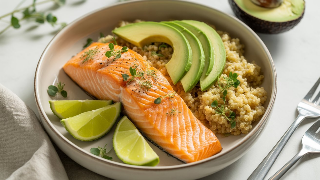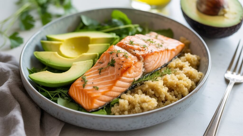 Pairing salmon with quinoa adds even more protein and fiber. Quinoa is a complete plant protein, making this dinner both balanced and nourishing.