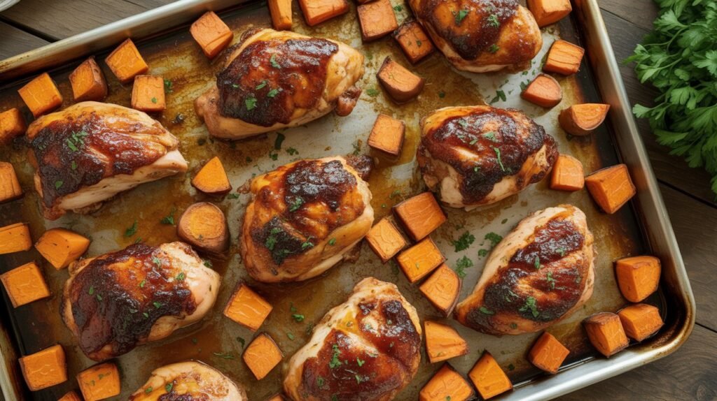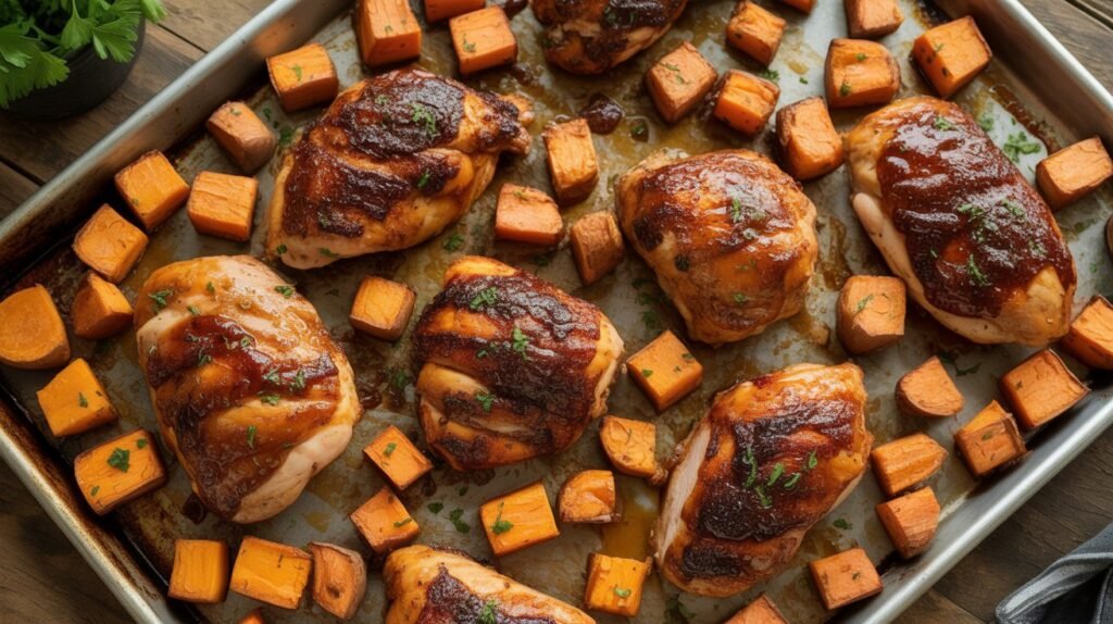 If your family loves bold, comforting flavors, this BBQ Chicken & Roasted Sweet Potatoes sheet pan dinner will quickly become a favorite. The chicken turns tender and juicy while the barbecue sauce caramelizes in the oven, creating a sticky, smoky glaze. Paired with naturally sweet roasted sweet potatoes, this meal strikes the perfect balance of savory and sweet.